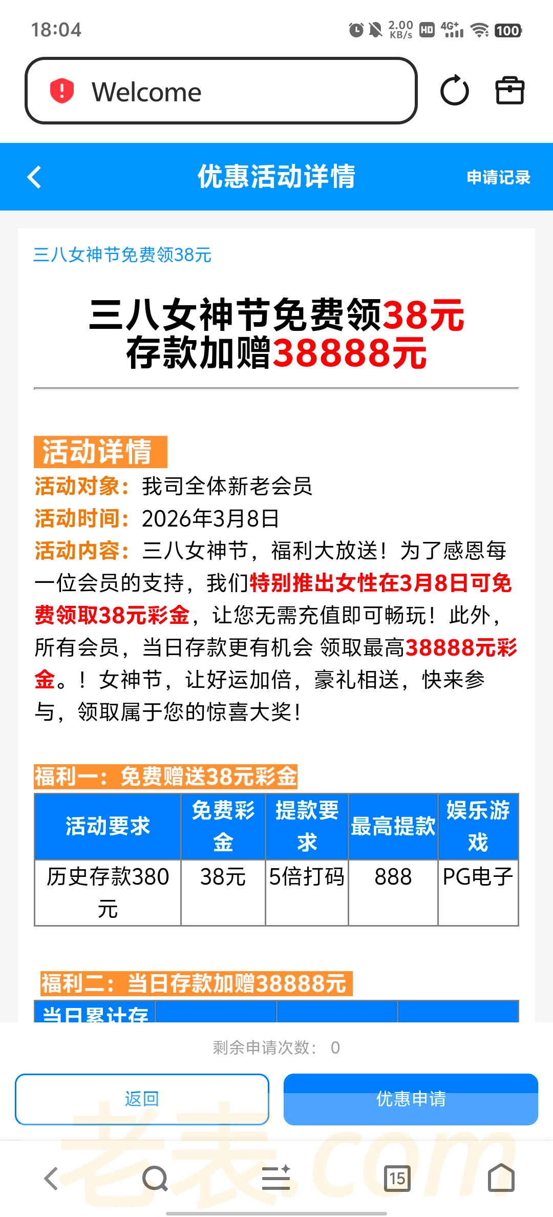 3月8号当天历史有充值380以上的去申请38免费彩金